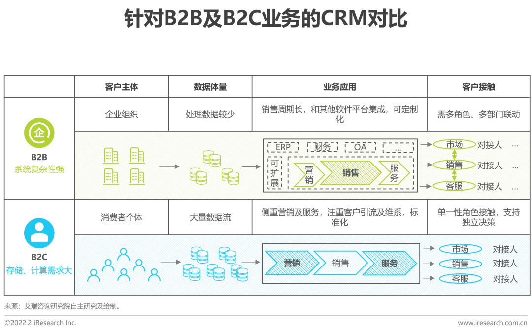 2B及2C業(yè)務(wù)模式的差異決定了B2B及B2C CRM的不同。B2B CRM的客戶主體為企業(yè),客戶數(shù)據(jù)量較少,支持復(fù)雜且長周期的銷售階段管理,支持定制開發(fā)和與其他企業(yè)級(jí)辦公軟件整合及對(duì)接。B2B CRM允許多端口接入,打通市場(chǎng)部、銷售部、客服部等部門之間及對(duì)接人、決策人之間的信息壁壘。B2C CRM則連接個(gè)體消費(fèi)者與企業(yè)各部門對(duì)接人,需存儲(chǔ)、處理大量數(shù)據(jù)流,其核心功能為北京電商研發(fā)公司的客戶引流潛在客戶、增強(qiáng)客戶粘度。