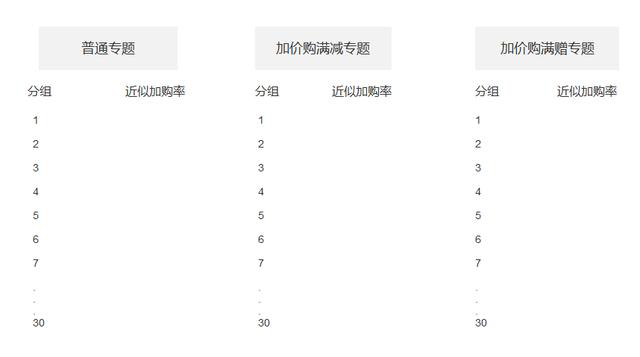 然后針對三個專題每一個專題抽取30個獨立用戶分組,用戶群的用戶基數近似相等,用戶群轉化率相似,采用相同的推廣渠道,由于無法精確確定用戶數量,我們只需告知推廣保證每日每個專題劃分的每一個群組的流量保證在一個特定數量XXXX左右,持續(xù)兩周,最終得出每個用戶分組的以下數據:從這個專題頁落地的用戶所下的訂單中,同時包含清倉產品與熱銷產品的訂單數/所有訂單數,我們給它起個名字叫近似加購率(因為即使在加價購專題里清倉產品和熱銷產品在一起也不一定就是參加加購活動加購的)。用圖表展現就是這樣: