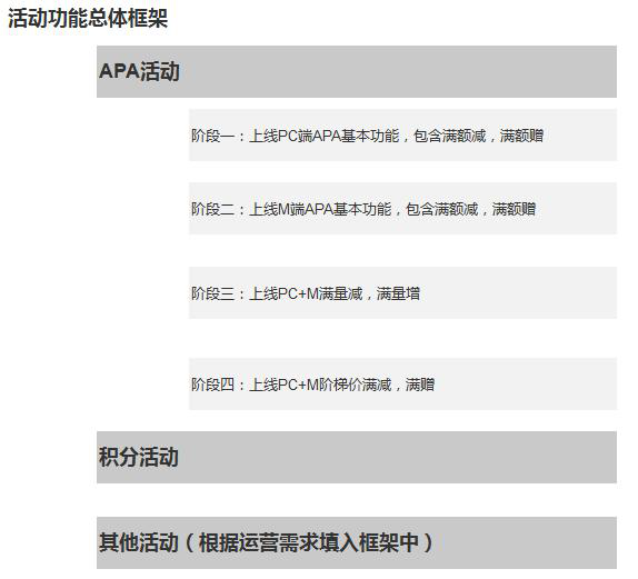 4.未來運營還希望能增加積分功能,滿贈功能等等其他活動功能(涉及后續(xù)功能擴展,不屬于這次需求之內,但是也要考慮)。