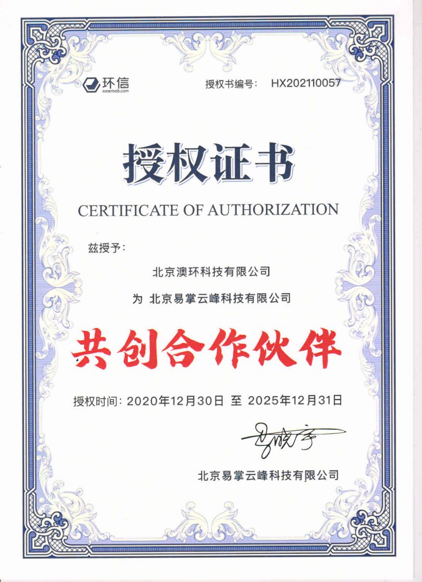 環(huán)信集團(tuán)與北京電商研發(fā)公司澳環(huán)科技一直保持著友好合作的關(guān)系,我司榮獲環(huán)信“共創(chuàng)合作伙伴”榮譽(yù)證書。這是環(huán)信對(duì)我司的贊美也是對(duì)我司的認(rèn)可。未來,澳環(huán)基于現(xiàn)有的行業(yè)優(yōu)勢(shì),整合優(yōu)勢(shì)資源,持續(xù)創(chuàng)新、與時(shí)俱進(jìn),通過自主創(chuàng)新技術(shù)與服務(wù),為客戶創(chuàng)造價(jià)值,為行業(yè)發(fā)展獻(xiàn)力。