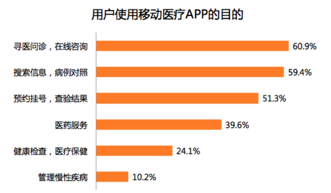 目前市場移動醫(yī)療APP,主要提供尋醫(yī)問診、掛號/導(dǎo)診、醫(yī)藥服務(wù)以及健康管理等服務(wù)。其中,尋醫(yī)問診類APP用戶滲透率最高,且使用目的性最強(qiáng)。據(jù)數(shù)據(jù)顯示,2018年第2季度中國移動醫(yī)療APP各類別用戶滲透率中,尋醫(yī)問診APP占比最高,為56.1%;在用戶使用移動醫(yī)療APP的目的方面,尋醫(yī)問診,在線咨詢同樣占比最高,為60.9%。