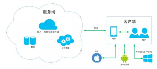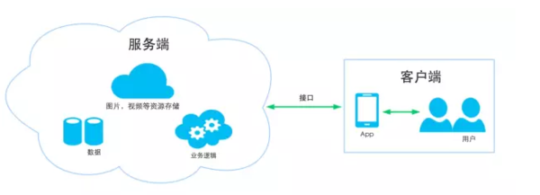 首先我們來看看App的構(gòu)成,一般一個完整的App產(chǎn)品包含服務(wù)端和客戶端兩個部分(如上圖所示),沒有服務(wù)端的App也有,像簡單的工具類,單機游戲,但是非常少,從經(jīng)營的角度考慮,為了積累用戶和數(shù)據(jù),大部分App都有服務(wù)端;客戶端就是平常我們從應(yīng)用商店下載到手機上的部分, 服務(wù)端一般提供數(shù)據(jù)讀寫存儲,處理業(yè)務(wù)邏輯,進(jìn)行圖片,視頻等資源存儲,部署在服務(wù)器上,用戶使用客戶端通過接口和服務(wù)端進(jìn)行交互,享受App提供的服務(wù)。