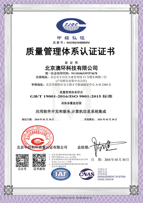 首先,慶祝北京澳環(huán)科技有限公司(以下簡稱澳環(huán)科技)順利通過ISO9001:2015質(zhì)量管理體系認(rèn)證!