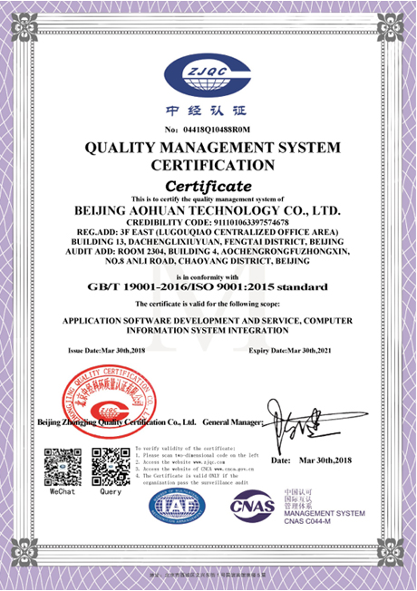 經(jīng)過認(rèn)證組根據(jù)ISO9001質(zhì)量管理體系的要求,對(duì)澳環(huán)科技所有部門進(jìn)行了非常細(xì)致且全面的審核工作,對(duì)管理手冊(cè)和程序控制文件等資料進(jìn)行仔細(xì)檢查,在認(rèn)證過程中認(rèn)證人員對(duì)于澳環(huán)科學(xué)的項(xiàng)目管理體系給予了充分肯定和高度的評(píng)價(jià),進(jìn)而澳環(huán)科技順利獲得國際ISO9001證書,同時(shí)這也標(biāo)志著公司的質(zhì)量管理體系已達(dá)到規(guī)范化、標(biāo)準(zhǔn)化、科學(xué)化的現(xiàn)代互聯(lián)網(wǎng)IT企業(yè)管理標(biāo)準(zhǔn),并且也能夠得到第三方機(jī)構(gòu)的認(rèn)可。