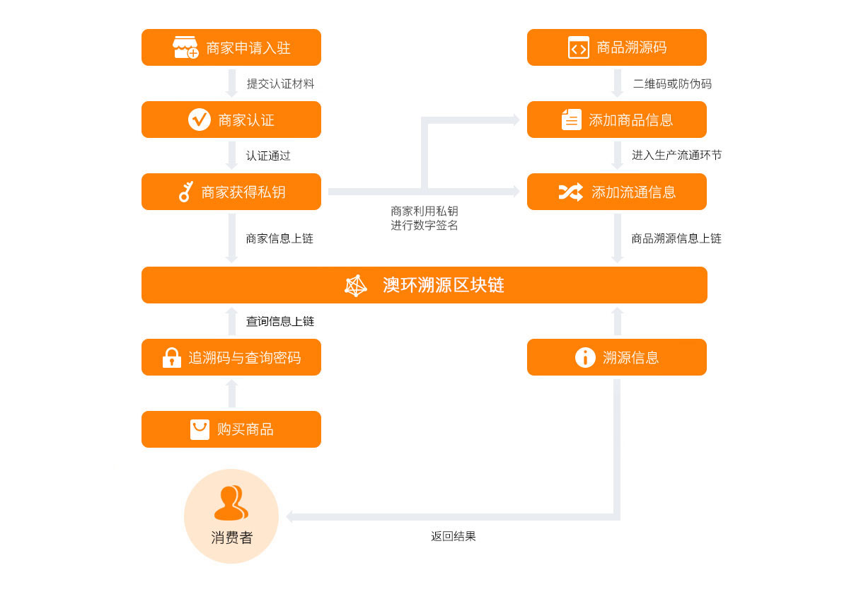 澳環(huán)區(qū)塊鏈結(jié)合區(qū)塊鏈特性,包括工廠、經(jīng)銷商、門店三種角色的不同管理方式,實(shí)現(xiàn)各業(yè)務(wù)環(huán)節(jié)的O2O閉環(huán),將產(chǎn)品—溯源碼—區(qū)塊鏈信息綁定在一起,依靠電商系統(tǒng)連接消費(fèi)者與溯源產(chǎn)品,在線驗(yàn)證查詢溯源,下單獲取商品溯源代幣,實(shí)現(xiàn)區(qū)塊鏈防偽,線下驗(yàn)貨、線上溯源的設(shè)想,同時(shí)溯源信息不可篡改,交易信息加密保存。
